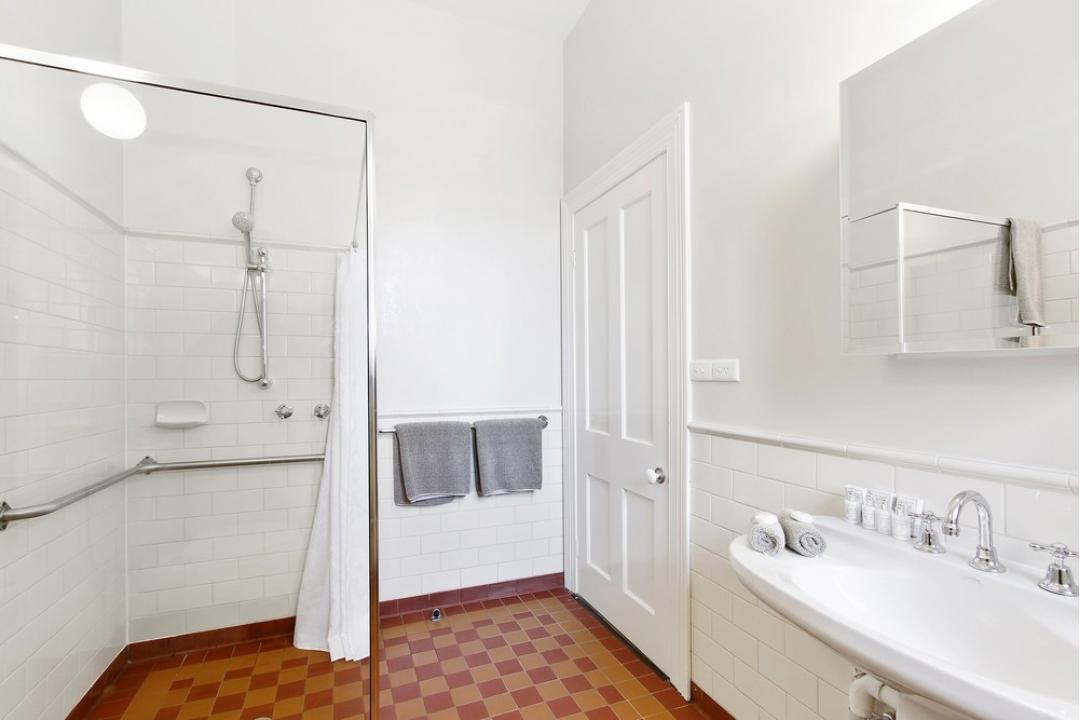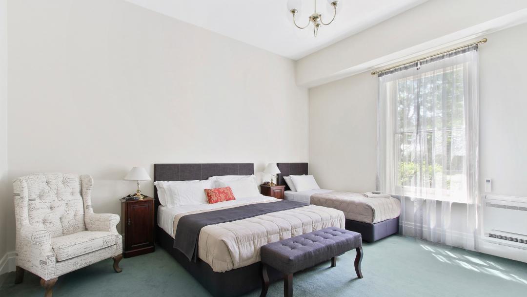 Our Deluxe Twin Room is located on the ground floor. The bedding configuration is 1 X King size bed & 1 X long single bed. The spacious private ensuite is also suitable for disabled access. The magnificent high ceilings, flat screen television and comfortable armchair makes the deluxe twin a suitable room for 2 or 3 adults or a couple travelling with a child.